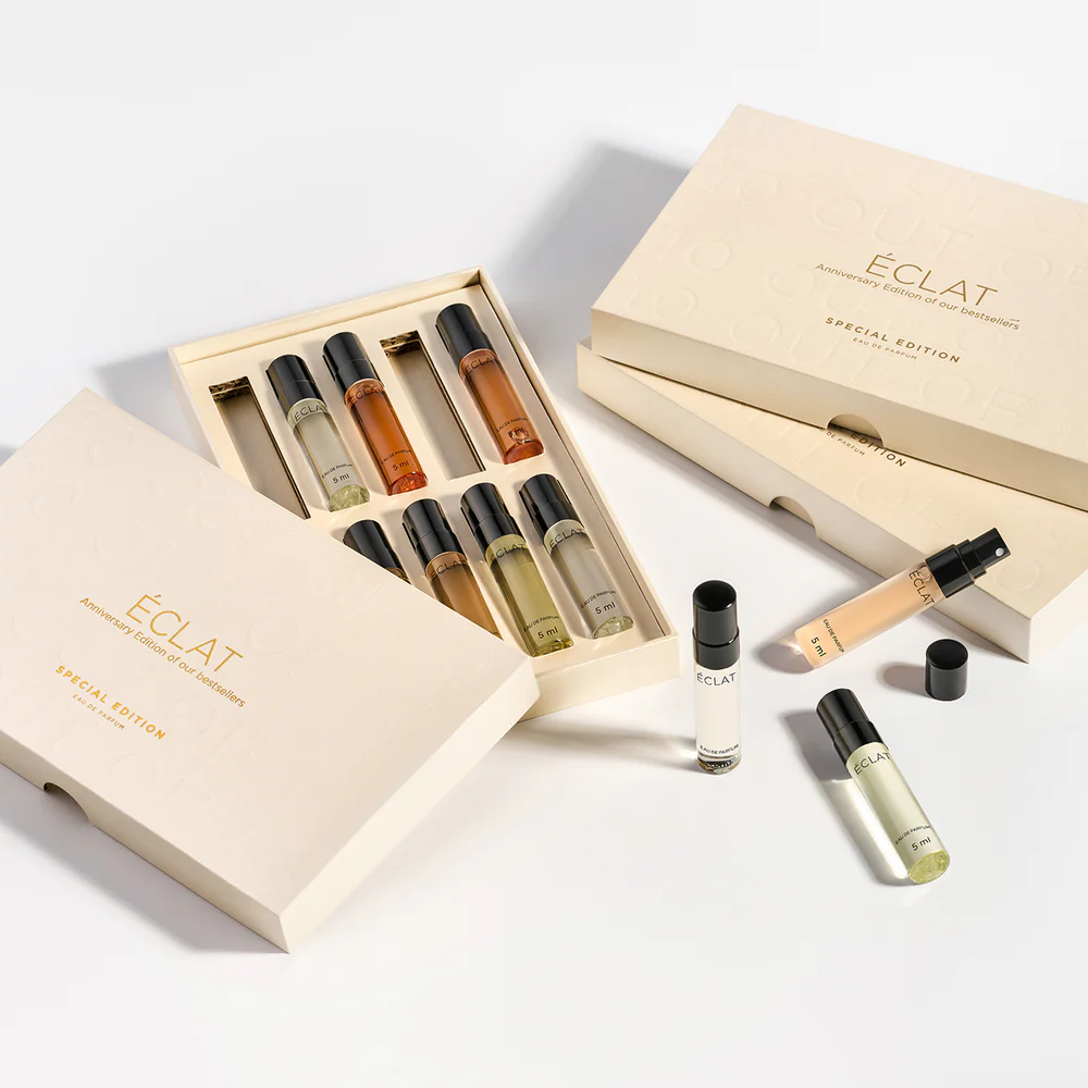 Packaging engineering and structural design, sustainable material development, paper-based insert construction, layout adaptation for ten fragrance samples (5 ml), print production supervision, printer consultation and prototyping, material and color specification, dry embossing design, foil stamping direction, mockups and product visualization, photography and visual presentation.